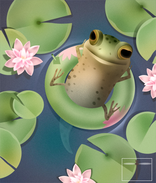 The pollywog sitting on a lily pad is composed of thirteen individual pieces of art. I added the first six images in my last post. Here are the additional seven images (Notice that the pollywog art here has been softened and slightly blurred to enhance the sense of a speedy plunge into the water.):